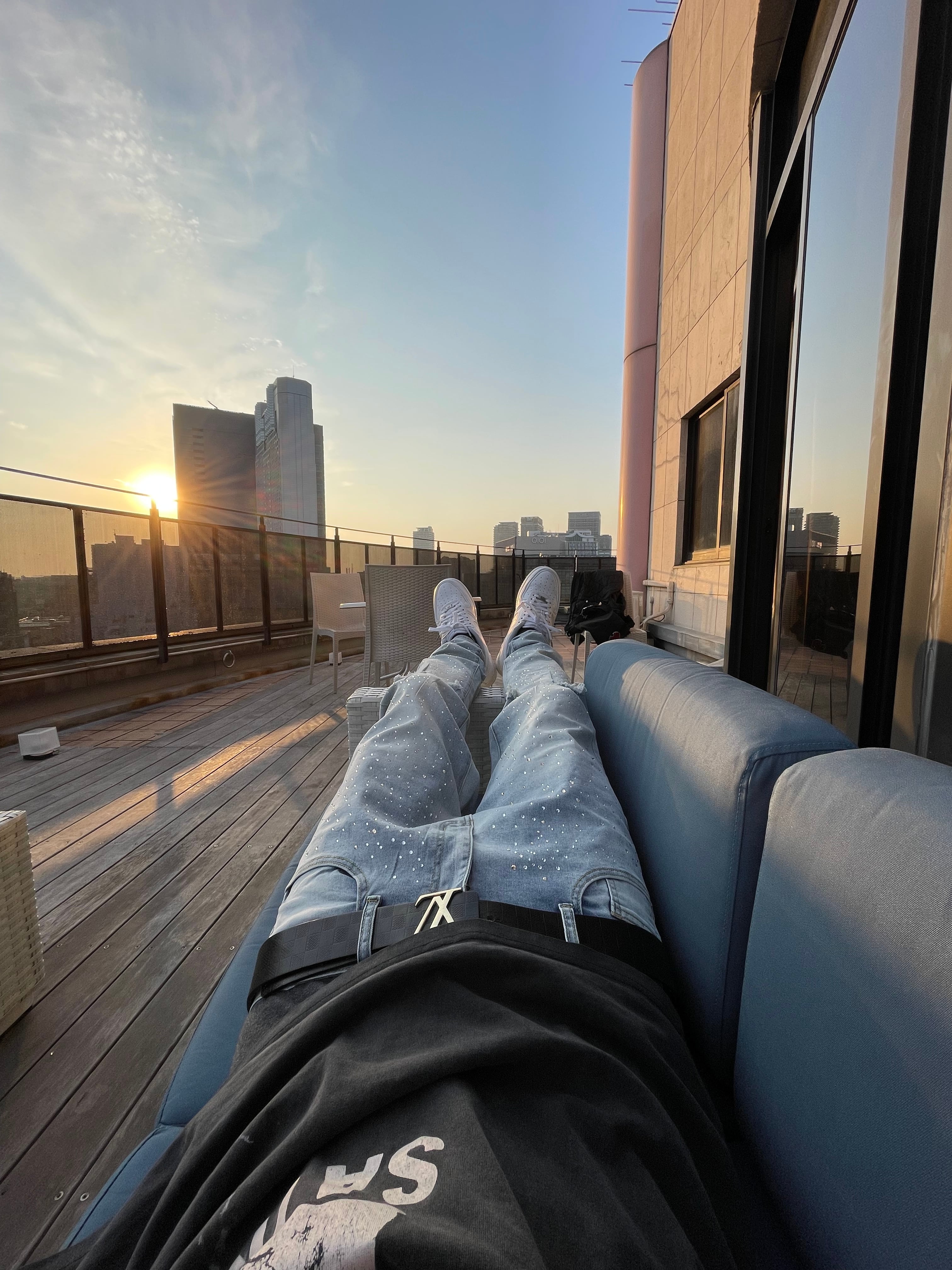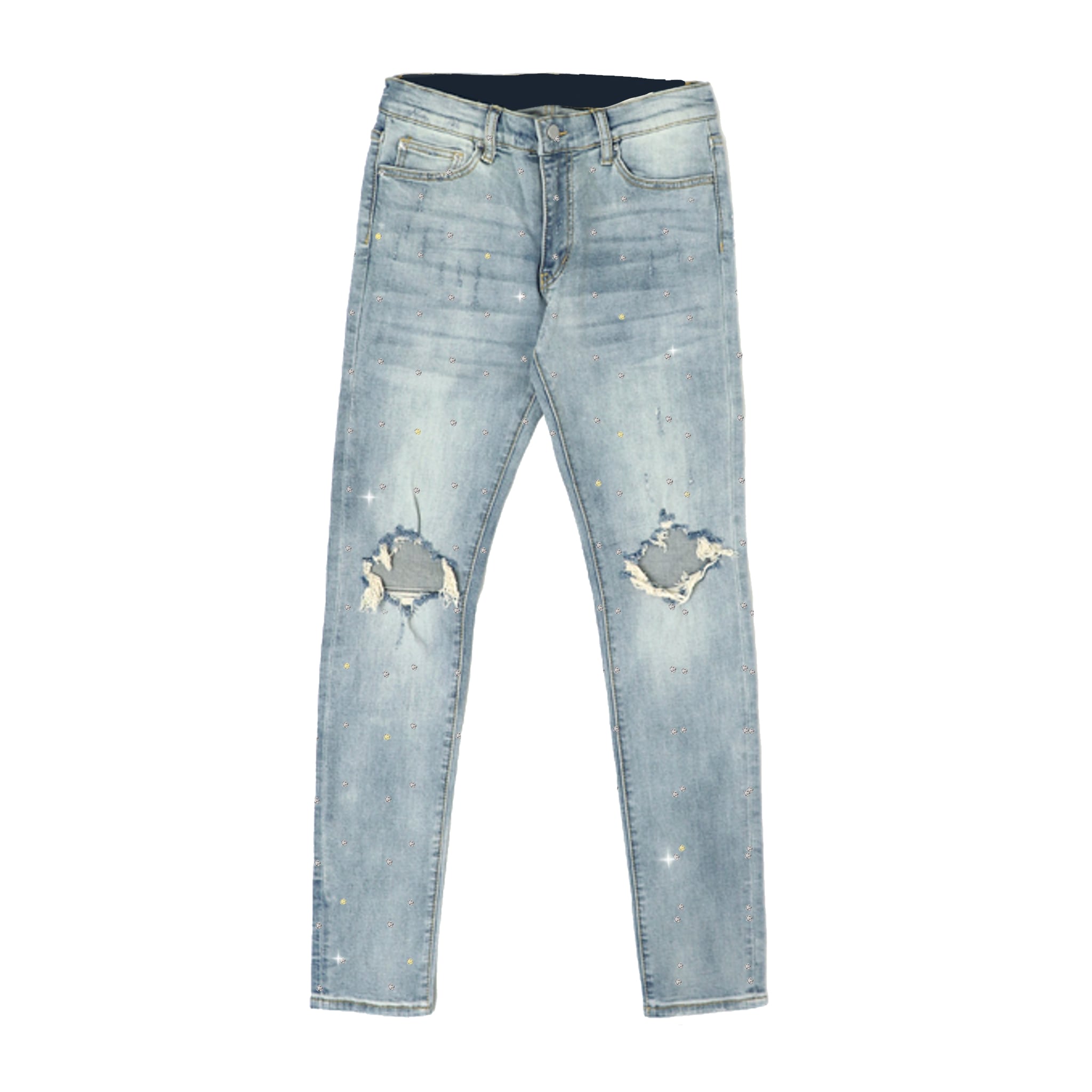 薄めのデニムにダイヤをまばらに散らばめてカスタムしてあります。太陽の光や夜にライトを当てるとキラキラ光る仕様になってます。